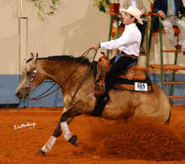 2008 & 2009 FEI World Open Reining Masters Champion, 2010 NRHA Futurity Open Reserve Champion, 2006 National Reining Breeders Classic Open Derby finalist, usw., 91.5 points: Superior Reining. Auch hat sich Smart Spook bereits als starker Vererber bewiesen, zu seinen erfolgreichen Nachkommen gehören u.a. SPOOK OFF SPARKS (out of Setting Off Spark by Shining Spark; $141,839, 2011 NRHA Futurity Co-Reserve Champion), RED STRIPE SPOOK ($139,113: NRHA Open Futurity Reserve Champion), SPOOK N SPARKS (aus einer Vollschwester zu WHIZDOM SHINES, by Topsail Whiz x Setting Off Spark; LTE $96,512, 2011 NRHA Non-Pro Futurity Champion) und