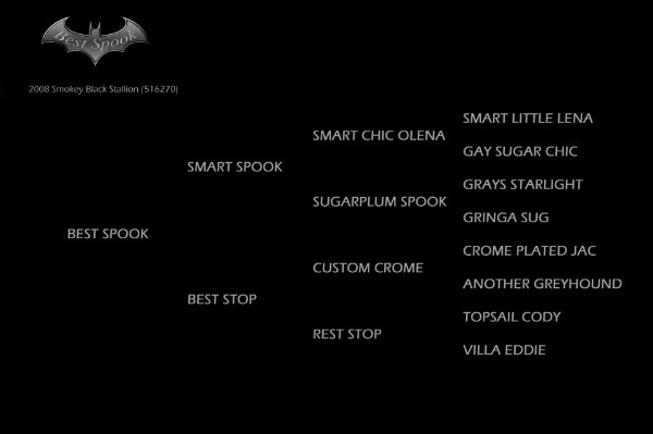 Vater von Best Spook ist: SMART SPOOK, Sohn und höchster Money Earner von Smart Chic Olena (NRHA 6 (!) Mio $ Sire ist, NRHA Hall of Fame Stallion und NRCHA 2.7 Mio $ Sire u.v.m.!) aus der Sugarplum Spook by Grays Starlight, die selbst 10 Money Earner, mit Earnings von über $ 500,000 und 350 AQHA points in Reining, Cutting und Cowhorse Events vererbt hat und Vollschwester zu NCHA Open Superstakes Champion, A Little Starlight (LTE $ 205,000) ist.